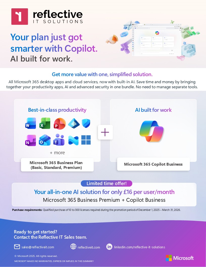 Reflective IT can help you deploy Copilot and train your team to make the most of its features. Contact us today to secure your discounted licences and start your AI journey.